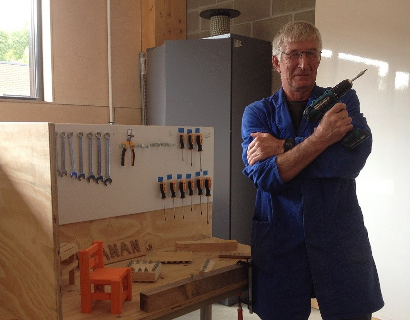 Op de foto zien jullie Meester Jan in zijn montage-atelier. Zoals altijd gewapend met de glimlach.
