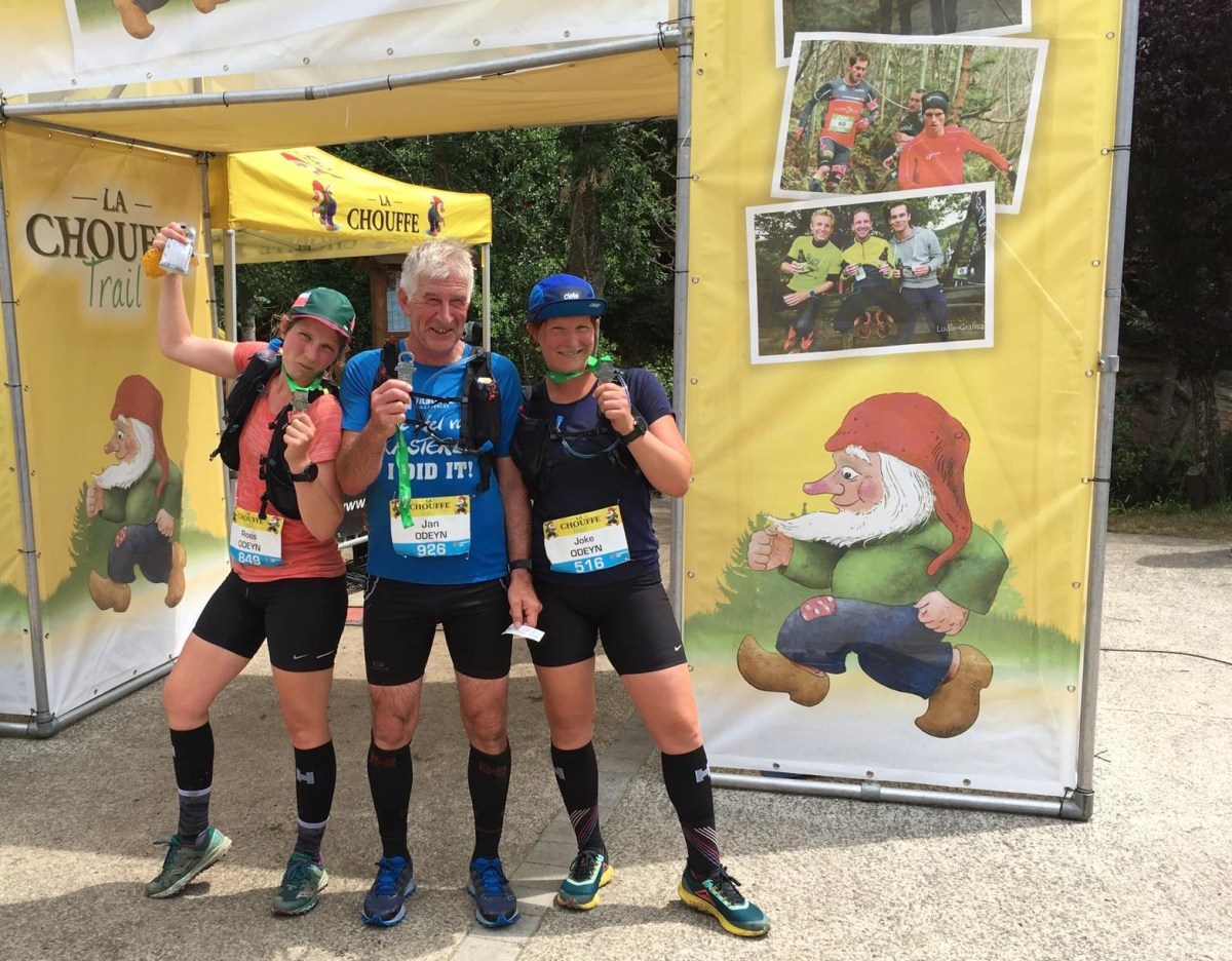 Roos en papa stonden vorig jaar ook aan de start in Houffalize voor 28 km trailplezier. Twee jaar geleden ging ik met papa een stapje verder en liepen we 50 km in en rond de brouwerij van Achouffe omdat ik zo graag eens verder dan een marathon wilde lopen. Ik denk dat ik toen ook de grenzen van de vaderliefde opzocht. Na amper 10 kilometer waren we al volledig kapot en danig onder de indruk van de hoogtes die we moesten trotseren. Onze missie leek uitzichtloos tot we na 6 uur de eindmeet haalden: dat bleek een goede prestatie voor een vrouw (ik) en vijftiger (papa). Dit jaar pasten Roos en ik wijselijk voor de trails van 68 en 47 km die ook op het programma stonden en gingen we voor de min of meer acceptabele 36 kilometer. Papa kon natuurlijk niet achterblijven en vervolledigde Team Odeyn. Hoog tijd voor een belevingsverslag van onze La Chouffe trail.