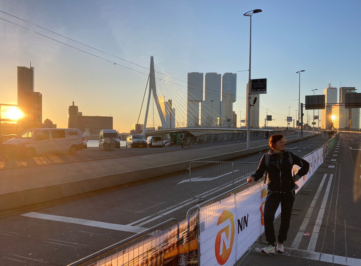 We vertrekken zondag om 7u in Den Haag. Om de trein naar Rotterdam te halen, moeten we een sprintje trekken op de fiets en lopend naar het perron. Als we met z’n drieën zitten uit te hijgen (en zweten) is daar het besef dat het nu echt gaat gebeuren. In Rotterdam is het nog opvallend rustig. Roos en mama gaan de metrohalte verkennen en nadien wandelen we samen richting startzone. We zijn zo goed op tijd dat de dixi’s nog ongebruikt zijn. Count your blessings. Wat een plaatje is de haven van Rotterdam trouwens! Om 9u30 sta ik vooraan in startvak 1 met zicht op de Erasmusbrug. Ondanks de kou probeer ik vooral het moment vast te houden. Gaat het nu écht gebeuren?