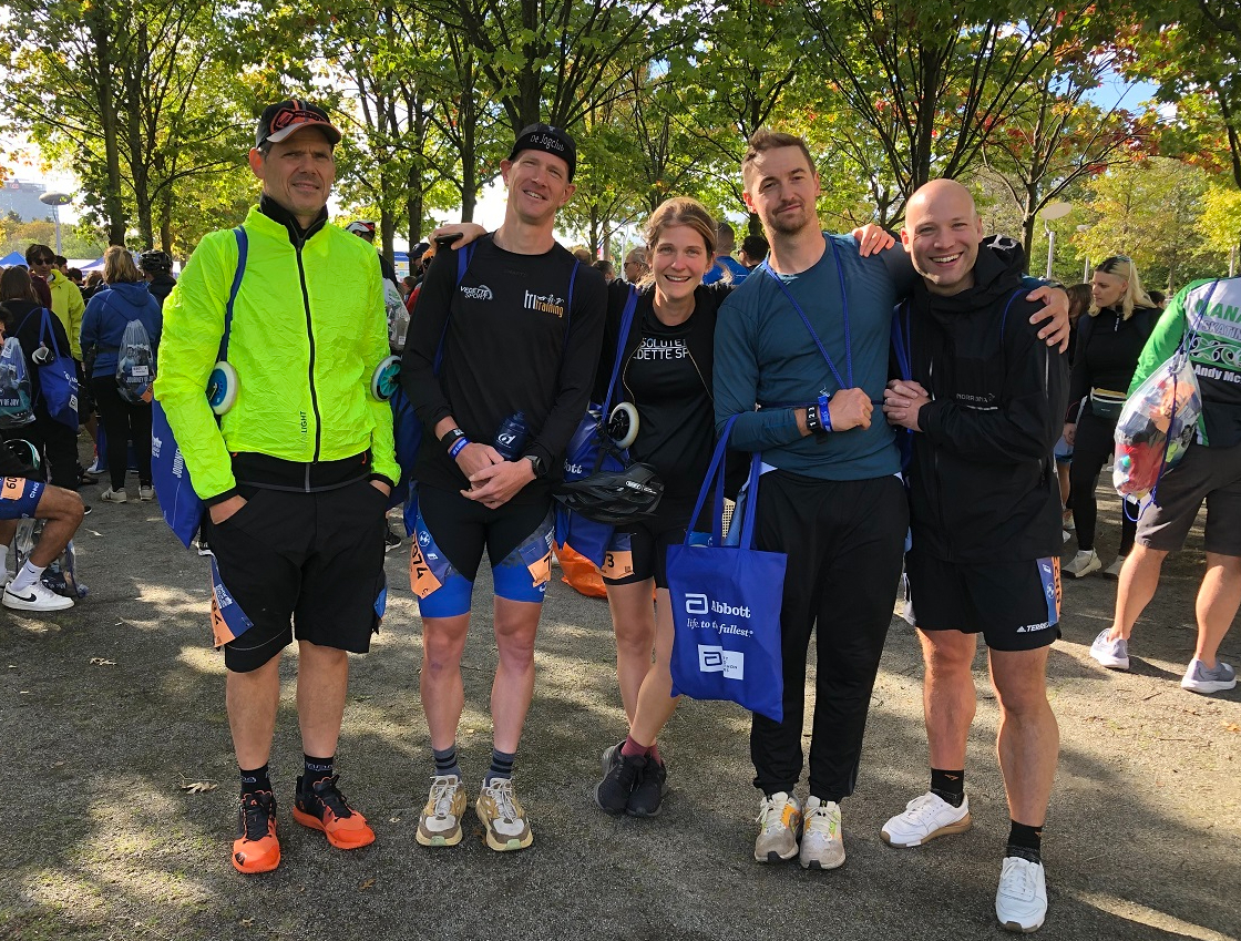 Allereerst verdient de uitrusting van onze delegatie ter plekke een vermelding. Een kamer delen met vijf, inclusief uitrusting en materiaal: ik kan jullie verzekeren dat je daardoor een stevige hoop spullen bij elkaar ziet. Zo snel en waaghalzerig als je skeeleren met snelheid voorstelt, zo is het ook echt. We hadden amper tijd om de eerste doorkomst van Bart Swings (veelvuldig winnaar van de skeelermarathon) te verwerken en daar denderde het ene na het andere peloton van topatleten aan ons voorbij. In spanning wachtten we af tot de eerste doortocht van ons team. Seppe en Bobby vormen niet alleen een hecht podcast-duo, ze zijn ook brothers in arms op wielen. Roos behoeft geen introductie meer, ze is de vrouw en stuwende kracht van het gezelschap. Dave was getooid in zijn werkbroek zonder de twijfel de coolste. Na een pijnlijke val in het voorjaar was hij op tijd in vorm om door Berlijn te jassen. Bart, een trail- en ultrarunner die eigenlijk niets met asfalt heeft, maakte het gezelschap compleet. Geheel tegen zijn lopers-DNA in, koos hij er – net zoals Seppe – voor om deel te nemen aan de combiné. Dat wil zeggen: de marathon skeeleren op zaterdag en de marathon lopen op zondag. Gekkenwerk.