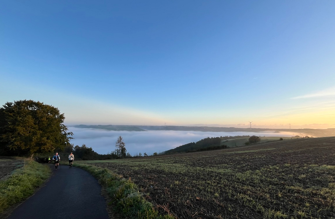 Een eerste mentale opsteker is het moment waarop we vanop een hoogte door de nevel in het dal de lichtjes van Bourscheid-Moulin zien, een prachtig feeëriek zicht dat een bevoorrecht gevoel geeft deze mooie dingen te kunnen beleven tijdens dit uitzonderlijk avontuur.