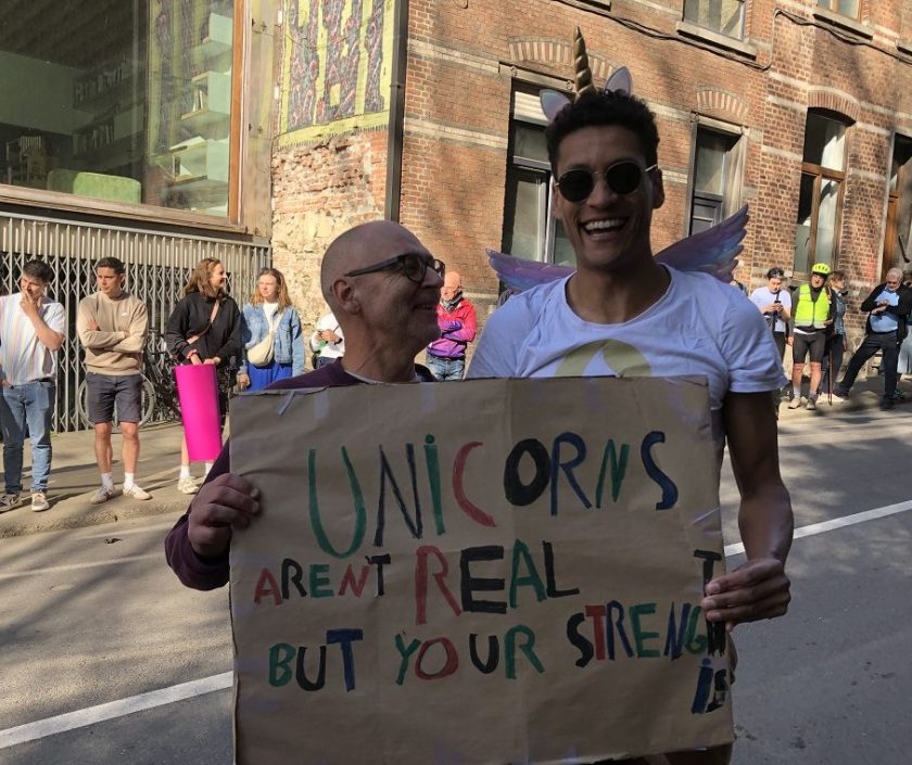 Ondertussen is het zachtjes beginnen regenen. Terwijl we romantisch met z’n allen schuilen in een prieel en ik (tevergeefs, zo zal later blijken) hoop op een opklaring van formaat, bereiden we ons voor op de start. Wachtend op Joni’s pupil Jan, heeft Sam het ideale (hopelijk ook legale) middeltje op zak voor Hans’ pijnlijke bil: een spuitbus met iets dat koud aanvoelt, maar eigenlijk warm is. Begrijpe wie begrijpen kan. Enfin, we geraken elkaar allemaal een beetje fysiek kwijt in de menigte en uiteindelijk zak ik met Hans en Sam af richting startzone op het Paleizenplein. Wat een decor! Een drone hangt boven onze hoofden aangezien we deel uitmaken van een live-uitzending op nationale tv. En dan is het tijd om afscheid te nemen: Sam staat in de box voor mij, Hans in het startvak na mij. Op de lekkere beat van Sean Pauls Temperature hoop ik stiekem toch op wat zon en bij Sweet Dreams durf ik te dromen van de ideale start. Na een plechtig moment inclusief volkslied en koning is het zover. Knal boem! Met vuurspetters en al worden we weggeschoten richting Leuven.
