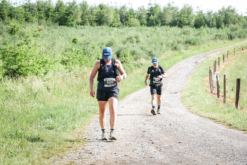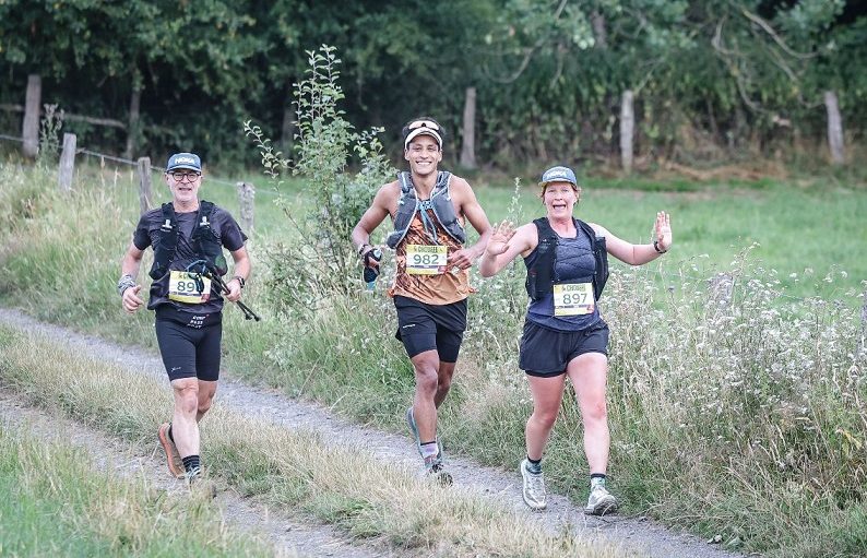 De beleving Het venijn zat in het midden. Ik voelde vrij snel dat de benen niet bepaald fris waren, maar dankzij onze praatgroep gingen de eerste 30 km relatief snel voorbij. De temperatuur viel toen ook nog mee. Het middendeel van het parcours zag er op het hoogteprofiel verraderlijk vlak uit. De adder onder de oeversteen was het “pad” langs de Ourthe dat we daar volgden. Eentje van het type waarbij je echt elke keer dat je je voet verzet moet kijken waar en hoe. Het zijn stukken waarbij je elke seconde en elke meter voorbij ziet kruipen, soms letterlijk. Bij ons alle drie zonk toen de moed in de Hoka’s omdat er werkelijk geen schot in de zaak kwam. Wat uiteindelijk heel goed mee viel, was het langste stuk tussen de bevoorradingen op km 46 en 62. We hervonden daar onze goede moed. Aan onze eindtijd kan je ook afleiden dat wij geen haast hadden, ook bij de bevoorradingen namen we de tijd. Sam was uiteraard entertainer en pr-manager van dienst. Hij speelde na elke bevoorrading een toepasselijk liedje en hield de loopvriendjes op de hoogte via filmpjes. Ook een verzoeknummer was mogelijk toen Hans in slaap dreigde te vallen na 66 km. Het was Ich will van Rammstein dat hem wakker hield.
