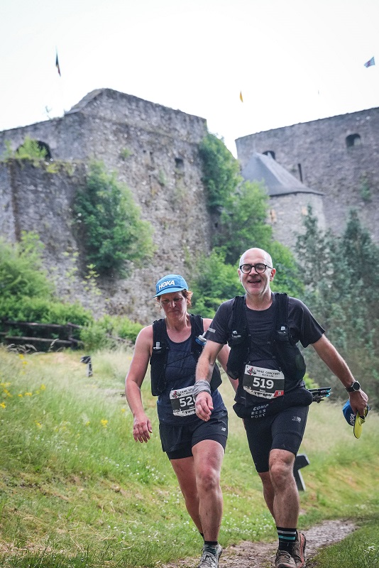 De aller-aller-laatste bevoorradingspost ligt op de speelplaats van de plaatselijke school in Corbion. Een vriendelijk koppel (leerden ze elkaar kennen in de vereniging of tijdens carnaval?) neemt hier de honneurs waar. We hebben 92 kilometer gelopen met 14 uur op de klok. Op voorhand hadden we een richttijd van sub16 uur voor ogen. Dat lijkt plots een haalbare kaart. Nu het einde echt in zicht is, wil ik de kilometers heel bewust beleven. Wat hebben we vandaag allemaal meegemaakt? Het blijft vechten voor elke kilometer. We krijgen nog twee heel venijnige klimmen van het zigzaggende soort voorgeschoteld. Als goedmakertje ook een mooie passage langs en dan over de Semois. Voetjes wassen en binnen lopen. Mijn geluk kan niet op als ik de 100 op mijn Garmin zie verschijnen. De voorlaatste klim brengt ons een prachtig zicht op Bouillon en dan gaat het steil naar beneden (zo’n afdaling waar je niks aan hebt). De aller-aller-laatste klim: de berg op naar de burcht! Waar we onderweg amper aanmoedigingen kregen, staat er nu een comité klaar dat ons met een hartverwarmend applaus binnenhaalt. En dan gebeurt het eindelijk ook echt: we lopen (ja echt, als is het heel voorzichtig) zij aan zij over die finishlijn na 15 uur en 45 minuten. 102,4 km hebben we elkaar gestreden met 3258 hoogtemeters. We hebben het gehaald – samen! Wat een dag!