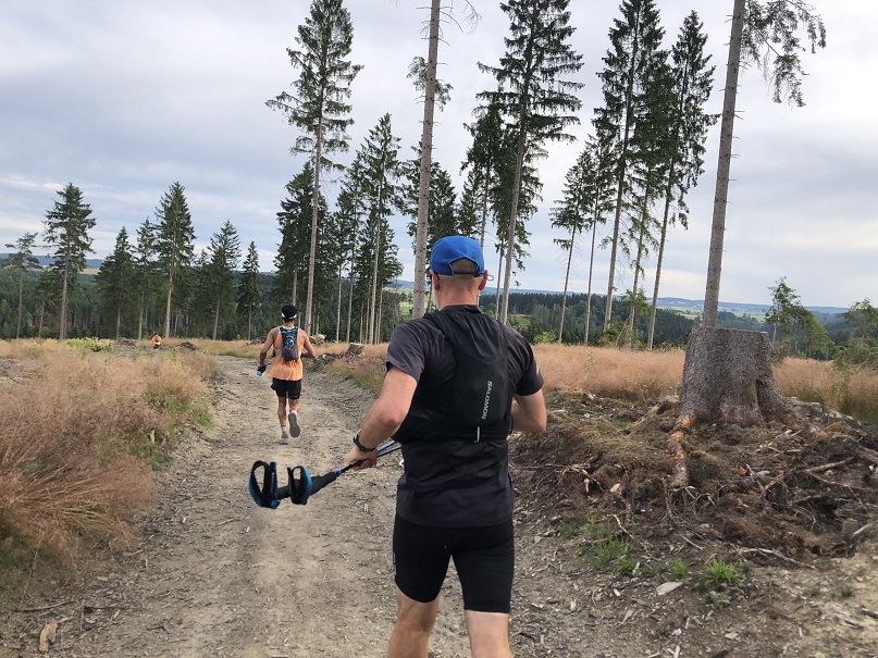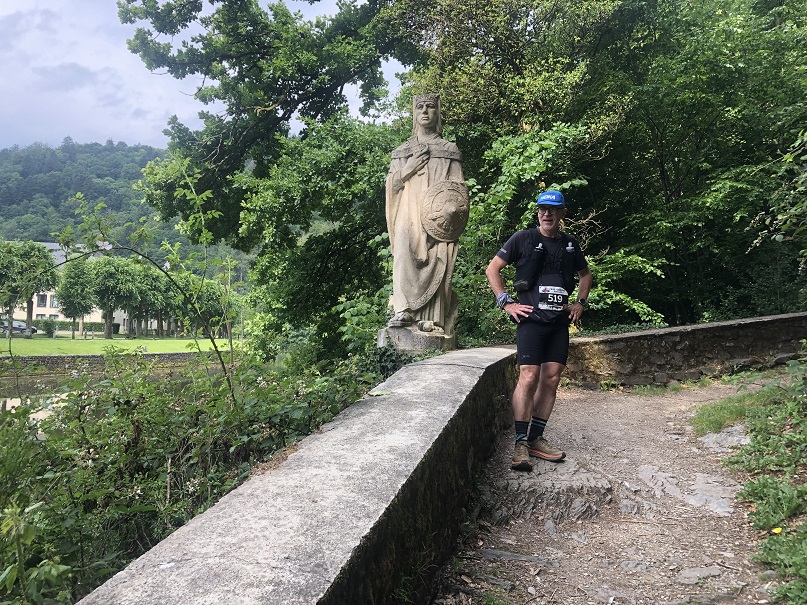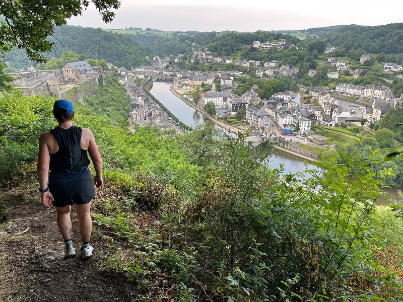 En of het een blij weerzien was toen we Bouillon binnenreden! Het vertrek van onze route lag bovenaan het chateau van Godfried. Ik stuiterde zowat naar beneden van enthousiasme. Richting Semois, langs het hotel waar we in juni verbleven en dan ging het meteen goed omhoog. Ik ging ook écht goed omhoog met dank aan een hulpmiddel: de trailstokken van Hans! Helemaal geïnspireerd door de UTMB die we langs de zijlijn meemaakten en vooral door de beelden nadien van een oppermachtige Ruth Croft die als een jekko naar boven pikkelt met haar stokken, besefte ik dat het moment wellicht is aangebroken om trailstokken te gaan gebruiken. In mei zullen we ons namelijk aan een volgend (buitenlands) 100+ avontuur wagen. Dat ik in het verleden mijn trails zonder stokken liep, heeft niks te maken met koppigheid of principes. Ik liep vroeger 1x per jaar een lange trail in de Ardennen: de Chouffe trail, die dan ook nog eens goed beloopbaar was. Om enkel voor die gelegenheid stokken van 200 euro aan te schaffen, daar zag ik de noodzaak niet van in. De tijden veranderen en zo ook de loper. Bij de volgende trailgelegenheid zullen jullie Joke Odeyn met stokken aan het werk zien!