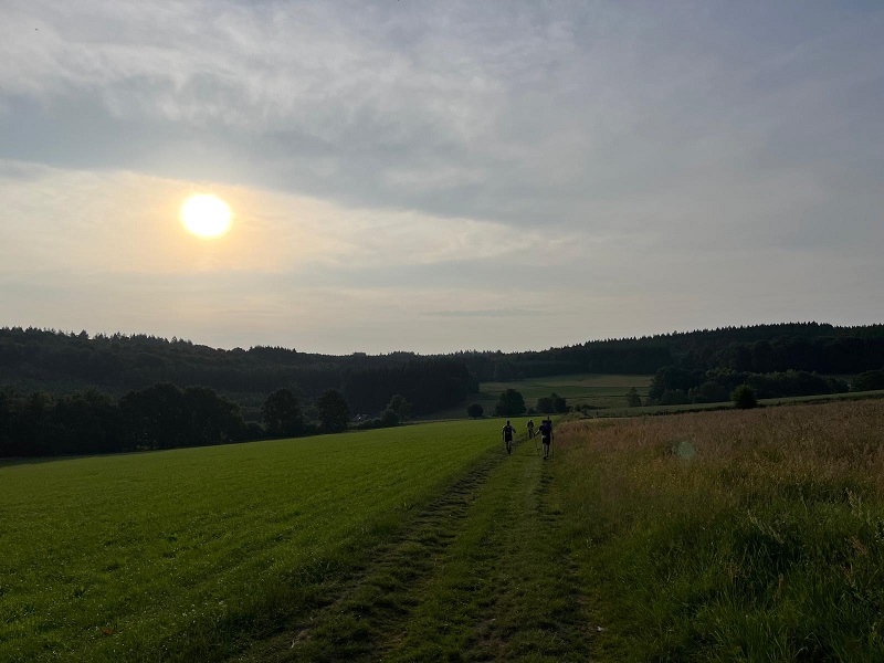 Tijd om te evalueren en na te denken De toch loopt (gaat eigenlijk) nu richting de Luxemburgse grens, die als waterscheidingslijn tussen de stroomgebieden van de Maas en de Rijn het hoogste punt vormt van het parcours. De ideale plek dus om de zon te zien opkomen, en dat is toch altijd een van de mooiste momenten tijdens ultratrails waarin je een nachtje moet “doorsteken”.