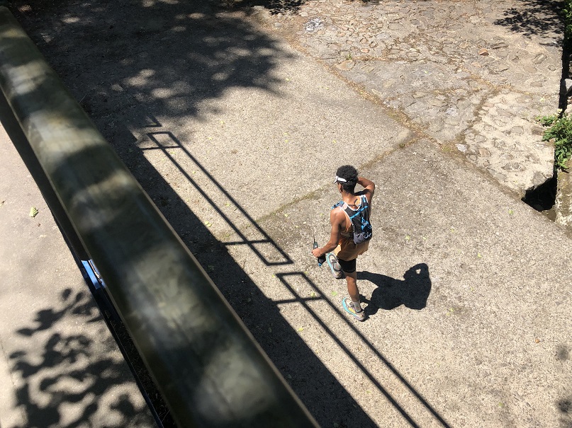 Wat je eigenlijk niet moet doen is aftellen. Ik probeer me te focussen op de afstand die al is geweest. Gelukkig heeft Hans ook heel veel parcourskennis. Hij heeft het routebestand op zijn horloge staan, waardoor hij precies weet hoe lang en hoe steil een beklimming is. Ook dat geeft wat richting en houvast. Met dik 70 kilometer in de benen gaat niks meer vanzelf: of dat nu een lange niet zo heel steile klim is of een kuitenbijter met een stevig stijgingspercentage. Elke stukje dat je kan lopen, al is het dan traag, doet de tocht vlotten. Van kilometer 76 tot 78 lopen we over een smal weggetje door het gras. Het doet zowel pijn als deugd om nog eens 20 minuten aan één stuk te kunnen lopen. Wat ook belangrijk is om “tijd te pakken”: een goede afdaling die dus niet te steil is, want daar heb je helemaal niks aan. Dan gaat het weer traag omdat je moet kijken waar je je voeten zet om voldoende af te remmen. Na 82 krijgen we er zo eentje voorgeschoteld. Het is een héél smal weggetje door dichtbegroeid struikgewas waarbij ik de vegetatie moet gebruiken om niet van de berg te rollen.