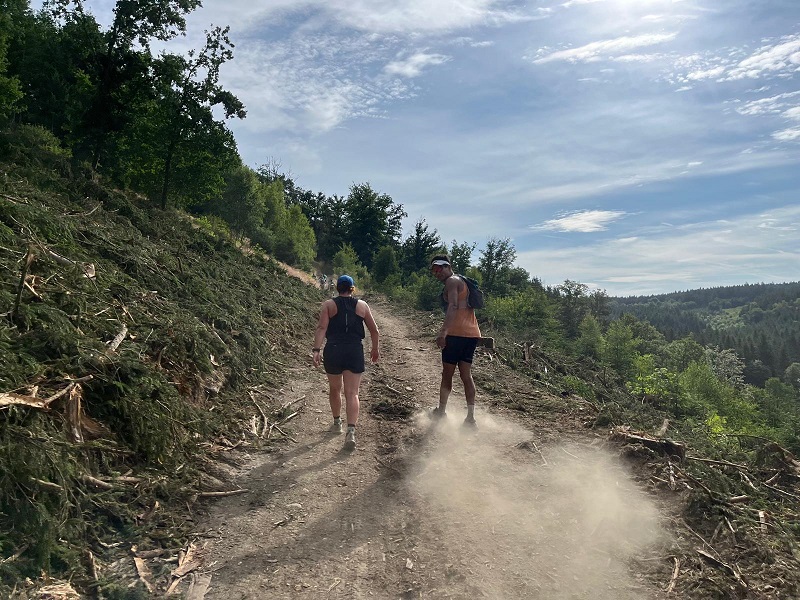 Onze eerste marathon is dik binnen als we na 44 km de derde ravito bereiken. We zijn 5,5 uur onderweg en bevinden ons in Les Hayons. Op aanraden van Hans gooi ik het over een andere boeg en ga ik aan de cola. In ultramiddens zijn ze het er over eens dat er geen betere sportdrank bestaat. Wauw, dit smaakt zo goed! Voor de beeldvorming: om half 9 ’s ochtends heb ik al drie liter water gedronken (zweten!), drink ik drie bekers cola na elkaar en neem ik nog een handje chips om de tank helemaal vol te gooien. Hoe trots ik ook was op mijn voedingsplan en alles wat me op training zo goed beviel: vandaag is het met cola en chips. Onthoud dat. Wat is het trouwens warm! Op 47 km maken we nog eens een filmpje voor de volgertjes thuis. Ik omschrijf de omgeving daarin als heel bosachtig (mijn woordkeuze is niet origineel als ik het zwaar heb). Berggeit-gewijs zetten we onze tanden in hellingen met gemiddelde stijgingspercentages van 15%. Het uitzicht is er dan ook wel naar.