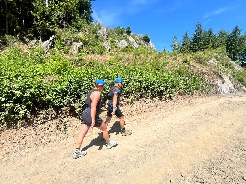 Terwijl ik fysiek heel duidelijk verval voel, breek ik er mentaal helemaal door. Ik ben potverdorie al helemaal hier geraakt!Nu begint het echt en ik heb er zin in! Na een kwartier vertrekken we weer. Het tweede deel van het parcours is pittiger. We lopen westelijk richting Vresse Sur Semois, een omgeving met steilere en ook wat technischere klimmen. Allesbehalve een walk in the park dus. Eerst gaat het idyllisch over de kade, vlak langs ons hotel de berg op. Ik vertel aan Hans dat ik al uren in mijn hoofd zit met het romantische Eurosong-lied Volevo essere un duro terwijl we aan een klim bezig zijn met stijgingspercentages tot wel 20%. Op 1 kilometer overwinnen we 145 hoogtemeters. Het geeft vertrouwen als je zelfs met 60 km in de benen nog vlotjes wandelaars voorbij steekt. De lucht is inmiddels betrokken en als we weer maar eens heel stevig aan het klimmen zijn, klinkt er ook gedonder en begint het zachtjes te druppelen.